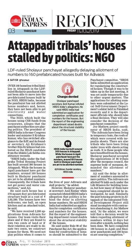to complete 1,000 houses in Attappadi in the first phase alone,” he said. HRDS India mobilises resources from CSR funds of corporates.